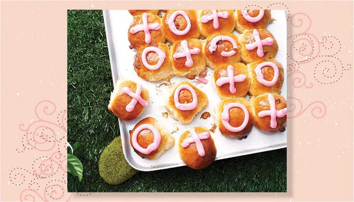 Inject an extra dose of fun for the kids at Easter, with these white chocolate-chip buns glazed with pink icing which they can use in games too.