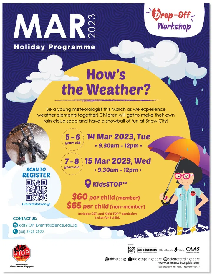 Is it possible for Singapore to snow? Why does it rain all the time on our sunny island? Be a young meteorologist this March and experience the different weather elements! Children will get to make their own rain cloud soda and have a snowball of fun at Snow City.
