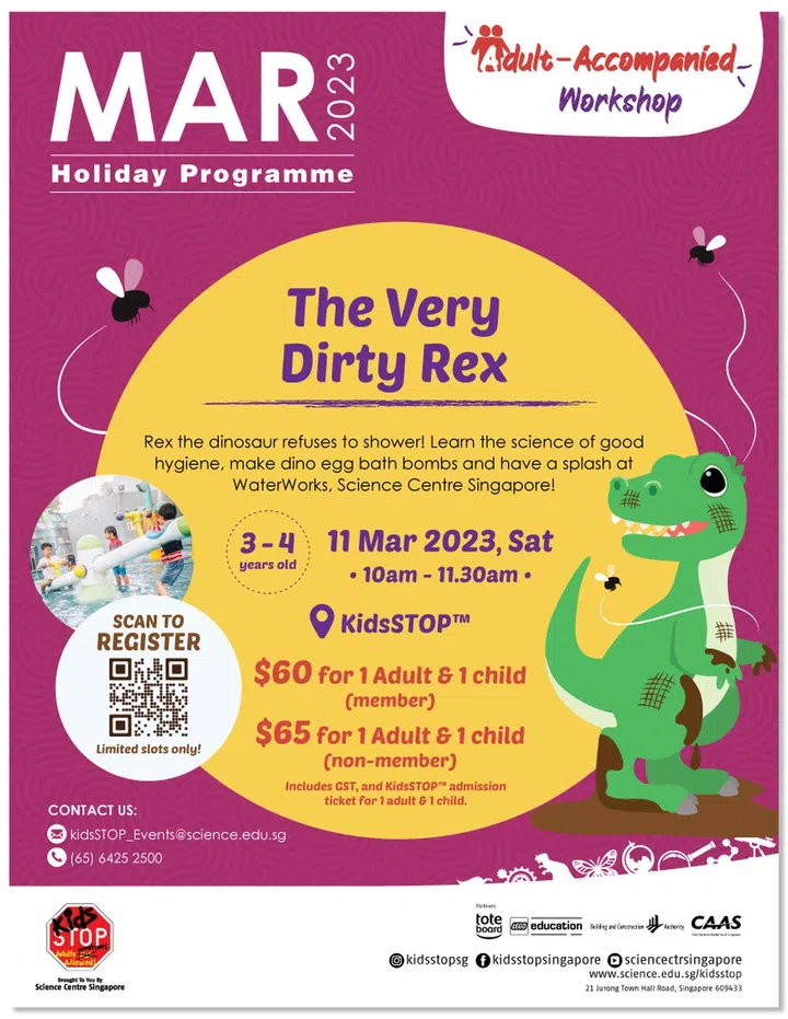 Help Rex the dinosaur learn about the science of good hygiene so that the naughty dino will finally step into the shower. Make dino egg bath bombs and end off the day with a good splash at Waterworks, Science Centre Singapore.