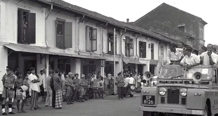 Then Culture Minister S. Rajaratnam and Deputy Prime Minister Toh Chin Chye visiting riot-stricken areas in their wards in an open-top vehicle on July 24, 1964, after the day’s curfew ended. PHOTO: ST FILE