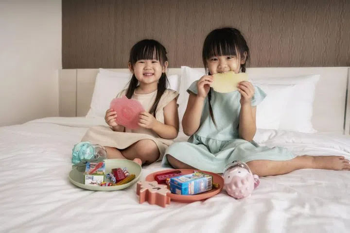 The room is also fitted with colourful kids amenities such as a children’s closet, hangars, bath toys, and toiletries.