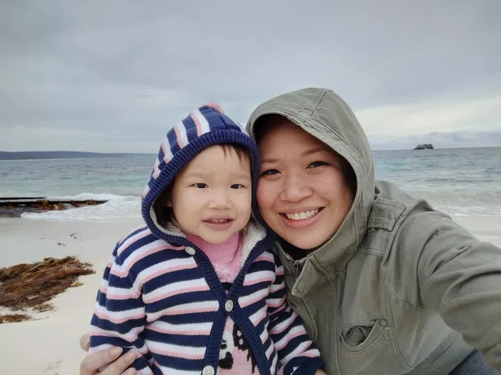 The writer (Sandra Lim) with her daughter at Gnarabup Beach, Perth in May 2023.