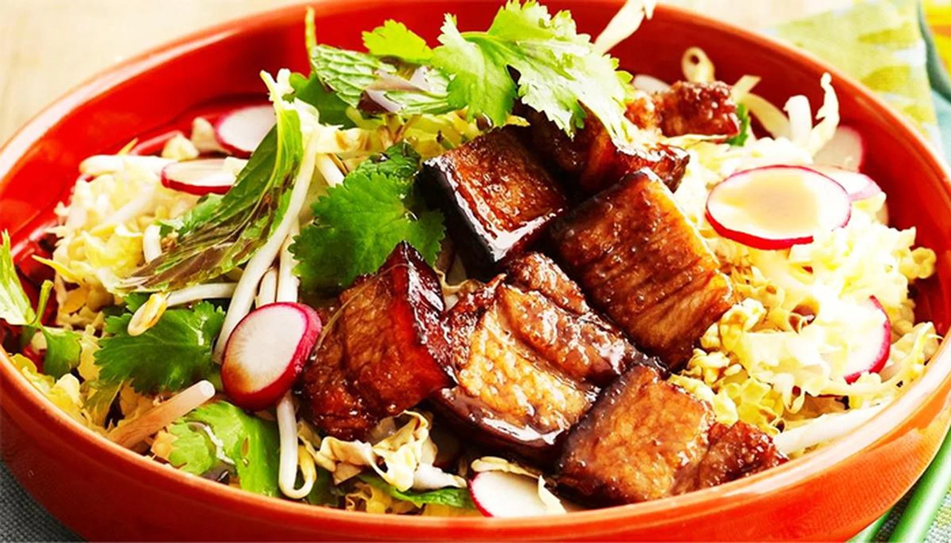 Serve up this yummy and nutritious pork belly salad as a nice starter or for a satisfying meal. If you have the time, leaving the poached pork uncovered in the fridge overnight will help dry out the skin for a crispier result.
