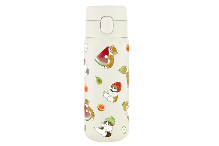 While KFC Mofusand keychains are purely decorative, this item is at least practical. Stay hydrated with this vibrant water bottle featuring fruit-themed Mofusand cats and a convenient one-push lid. It is also insulated to keep drinks cold or hot for longer.