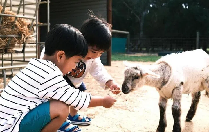Ezra Isa Imran (left) and Elia Adam Imran feed a baby goat in Perth. PHOTO: ANDREA CHONG