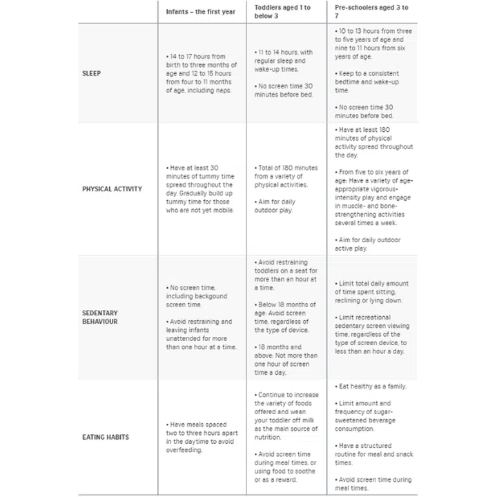 The recommendations go beyond the existing national activity guidelines for children aged below seven, which were released in 2013 by the Health Promotion Board.