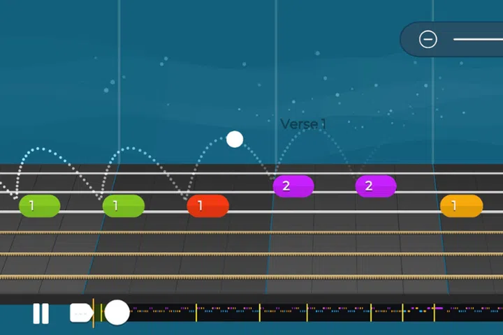 There are many exercises for you to complete throughout the courses. A little white ball will bounce across the screen according to the beat of the music to help you keep count. When learning how to play basic melodies, the fingers on the left hand are also given specific colours to help you keep track of which finger to use on which string and fret. Since the app offers instant feedback, you'll know immediately if you come in too early or late, if you played the wrong note, and whether your note is "dead".