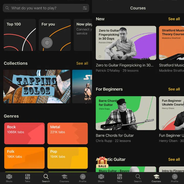 Ultimate Guitar is available on both the App Store and Google Play Store. Functions and courses necessary to learn the guitar can be found without paying for the pro version. Ultimate Guitar Pro is priced at $12.98 per month and $39.98 per year (offer price).