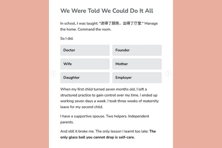 Yanni lists her roles – doctor, founder, wife, mother, daughter, and employer. She has a supportive spouse, two helpers and independent parents. She wakes up at 6am, preps the kids for school, and only returns home at 8pm after work, on top of helping with homework, revisions and keeping up with parent-teacher communication platforms. Yet she finds it hard to juggle all these balls and keep them from falling.