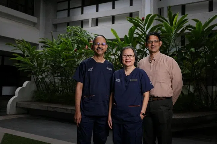 The team that carried out the transplant and managed Elvia Lim’s MSUD: (from left) Adjunct Associate Professor Vidyadhar Mali, Associate Professor Denise Goh, and Assistant Professor S. Venkatesh Karthik. ST PHOTO: ONG WEE JIN