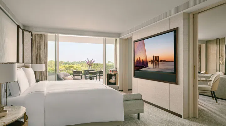 Meanwhile, grown-ups can enjoy amenities like their own king-sized bed with luxury bed linen from Frette, a 75-inch Samsung TV, and a two-person bathtub. Plus, a view of the Gardens by the Bay, of course.