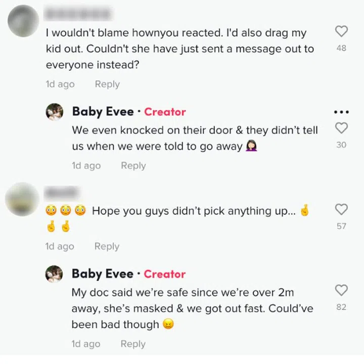 "My two-year-old was about to go towards her so I grabbed her," Tanmizi wrote, adding that she did not understand why her cousin's wife told them in person when she could have done so over text or when they were in separate rooms.