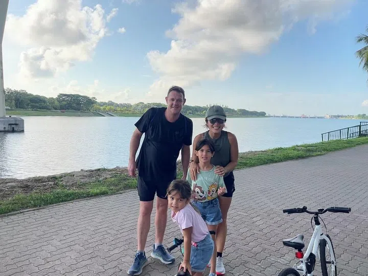 Yvonne with family at the Marina Promenade. She runs while her family cycles – one of their favourite outdoor activities together. Image courtesy of Yvonne Chee.