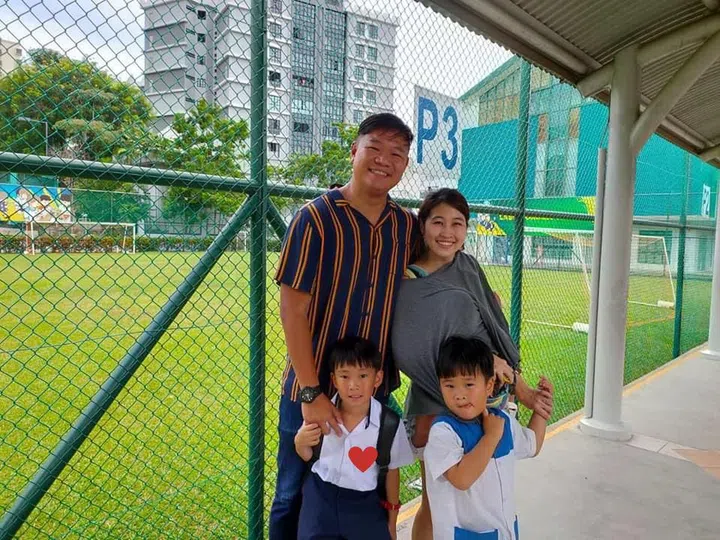 Kelly and family with her firstborn (bottom left) on his first day of Primary 1 in January 2020. Image: Kelly Ang