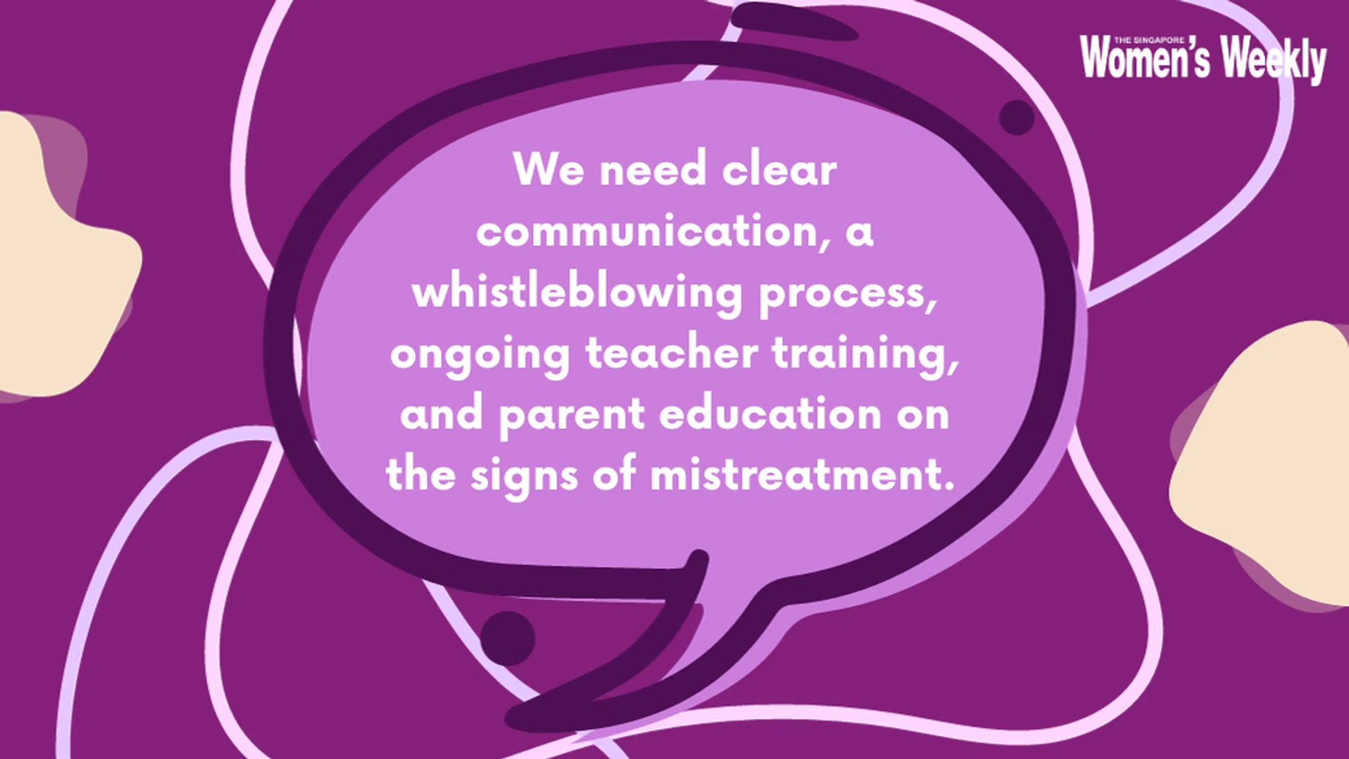 Angeline shares a similar sentiment. “The number one priority of enhancing our children’s safety in childcare centres must begin by securing government support to re-evaluate and improve the teacher-child ratio. As teachers are often overworked, better ratios would foster increased patience and attention.”