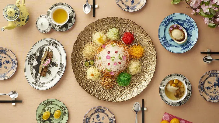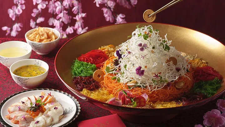 Tuck into an exquisite selection of yusheng platters at Cantonese restaurant Hai Tien Lo. The chef’s recommendation is the Blossoming Treasures Yu Sheng, a decadent and indulgent platter that comes with Gold and Silver Flakes, Lobster, Scallops, Black Caviar and Shredded Vegetable Salad in Passion Fruit. Signifying flourishing wealth and prosperity to the household, raw shredded vegetables artfully plated in the shape of two bull horns, which are traditional symbols of wealth in Chinese culture, surround an elegant salad mound in the centre of the plate.
