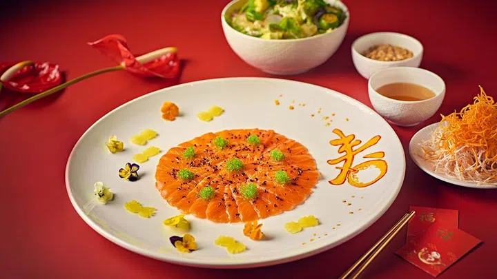 Created with a contemporary touch, this artful Joyful Blessings Lo Hei embodies the season with edible flowers, goldfish-shaped Japanese pickles and a hand-illustrated Chinese character. Wasabi flying fish roe and dried kombu atop, raw salmon slices are delicately arranged in a circle to symbolise harmony and unity, finished with sea salt and a drizzle of extra virgin olive oil. The platter also features jellyfish, agar agar strips, and an array of vegetables and fruit such as romaine lettuce, wild arugula, yellow frisee, red shiso, red, white and green radishes, purple shiso, red sorrel, pickled melon strips and fresh pomelo. On the side are deep-fried yam and sweet potato strips, crushed peanuts, white sesame seeds and pine nuts, as well as a dressing made from plum sauce, strawberry jam and calamansi juice.