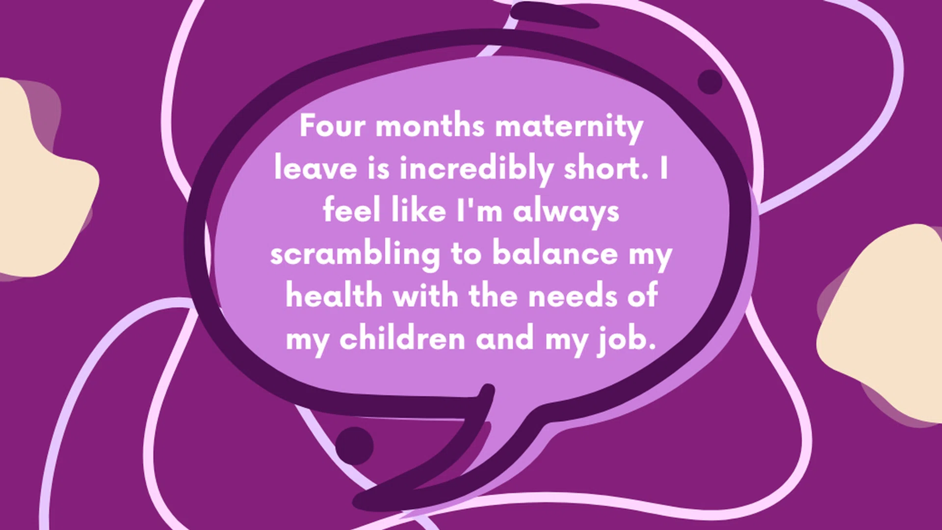 With my first child, I was off work for a year. That gave me a lot of time to spend with my first child, which I really treasured. It felt like a healthy amount of time to recover before coming back to work (we were lucky we could afford it). But with my second, while I really wanted to go back to work, four months felt incredibly short. Since then I feel like I've been scrambling to balance my health with the needs of my children and my job.