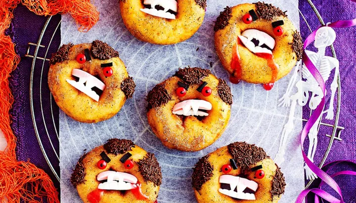 Bite into these Dracula doughnuts before they bite you! You can make some bloody versions using strawberry sauce for an even scarier treat.