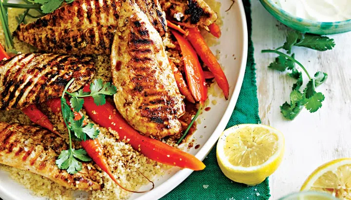 With nicely spiced chicken breast fillets and baby carrots atop couscous, this dish is also really healthy and a great sharing plate.