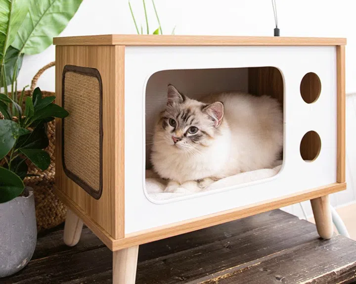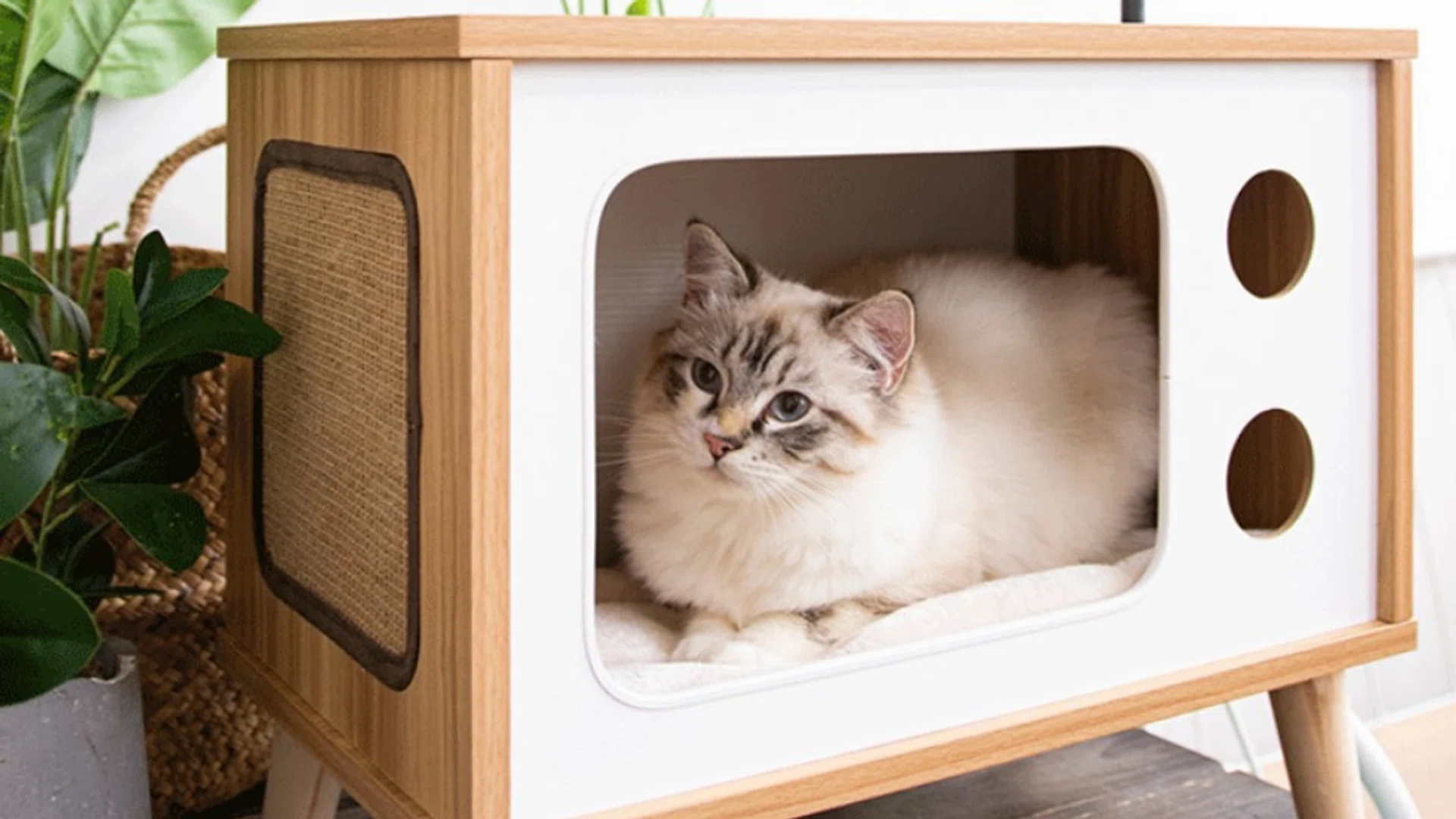 Shaped like a charmingly retro television set, this white-and-wood cat hideaway provides a safe place for your kitty to rest in, and functions as a side table too. There’s even a scratcher at the side.