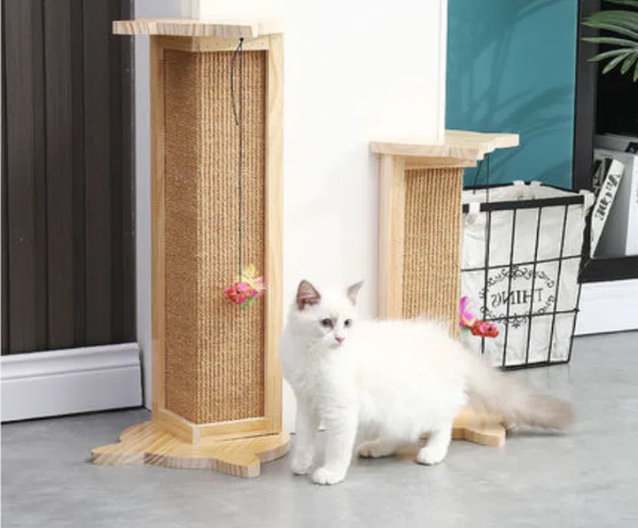 Made of sisal and wood, this freestanding scratch post comes in two shapes: a standard round one or an L-shape you can prop against a corner for stability. It come in white and brown, and you can opt to have a toy attached.