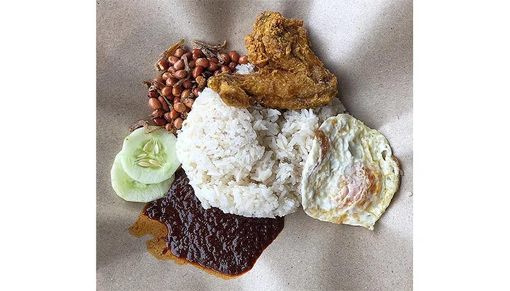 Know that it is fluffy enough and lightly scented, not with coconut milk but with extra virgin coconut oil. The sambal looks lethal but is not. Sweetness and a hint of spice are what come through. Crunch comes from cucumber slices, a scoop of peanuts and anchovies, and a fried chicken wing wearing a thick, deep-fried armour. The egg is crispy and lacy at the edges.