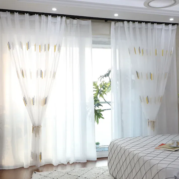Replace your bulky, heavy, thick curtains with a light and airy curtain that you can hang just a couple of inches from the ceiling as opposed to just above the window. This will elongate the window and give the illusion that the ceilings are taller.