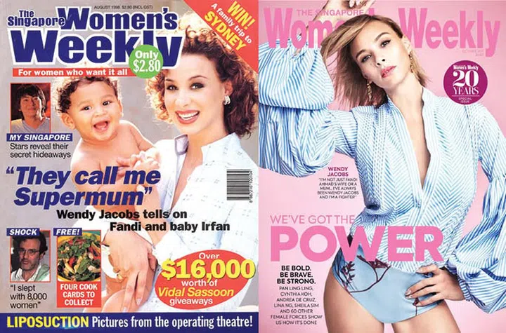 From left: Wendy Jacobs with her son, Irfan Fandi, in our August 1998 cover, and in our October 2017 20th anniversary issue.