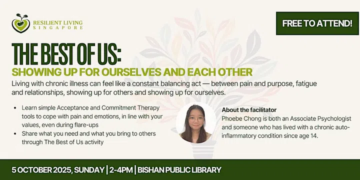 Living with a chronic illness isn’t easy and it can hinder opportunities to show up – both for yourself and others. Phoebe Chong, an associate psychologist who has been living with a chronic auto-inflammatory condition since she was 14, shares about Acceptance & Commitment Therapy (ACT). You’ll learn how to handle thoughts and emotions, as well as live more meaningfully, even when your illness gets in the way. Learn how to anchor yourself with mindfulness and meet others who understand what this journey is like.
