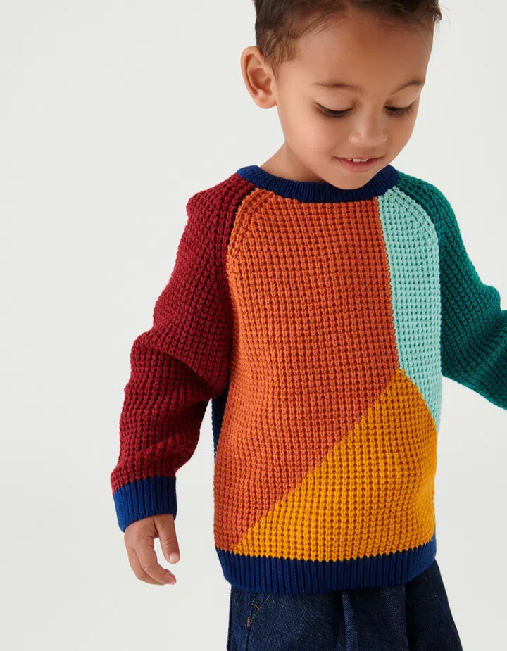Planning a year-end holiday for the family? How about this colour-block sweater! It’s a modern approach to childrenswear design that eschews the obvious cutesy print and has a timeless appeal to it.