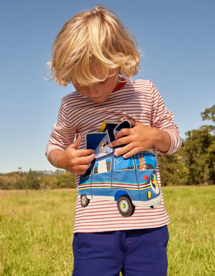 How’s this for wearable, interactive fun! A classic striped shirt gets a cute update with a travelling caravan. Lift the windows up and get a surprise of cruising critters!