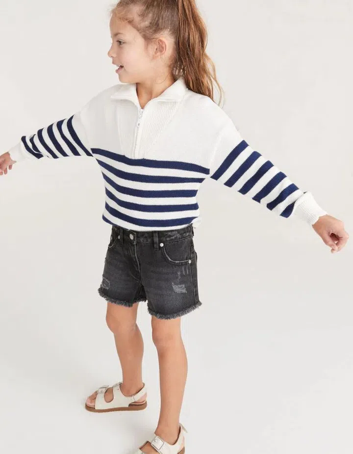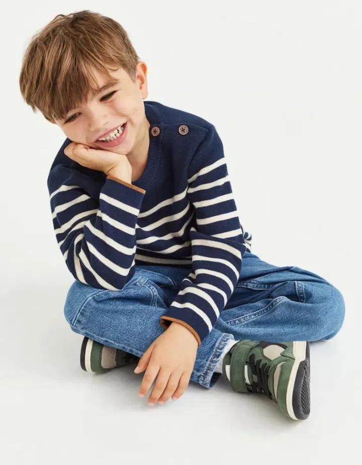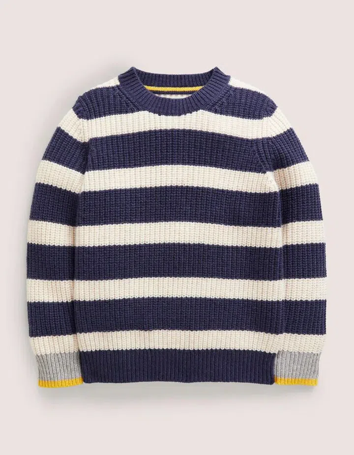 A plush striped knit with subtle mustard trims that promises to keep your kid warm and cosy when the temperature drops.
