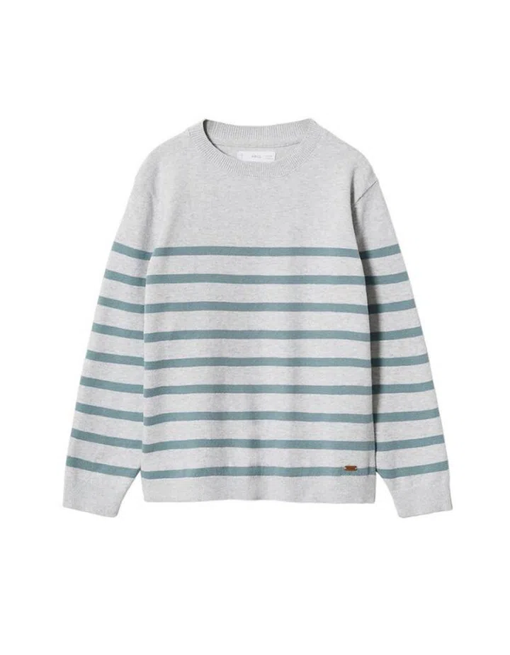 Buck the usual blue/ white/ black combos and swing for something a little more unexpected in this heather grey and green striped sweater for kids.