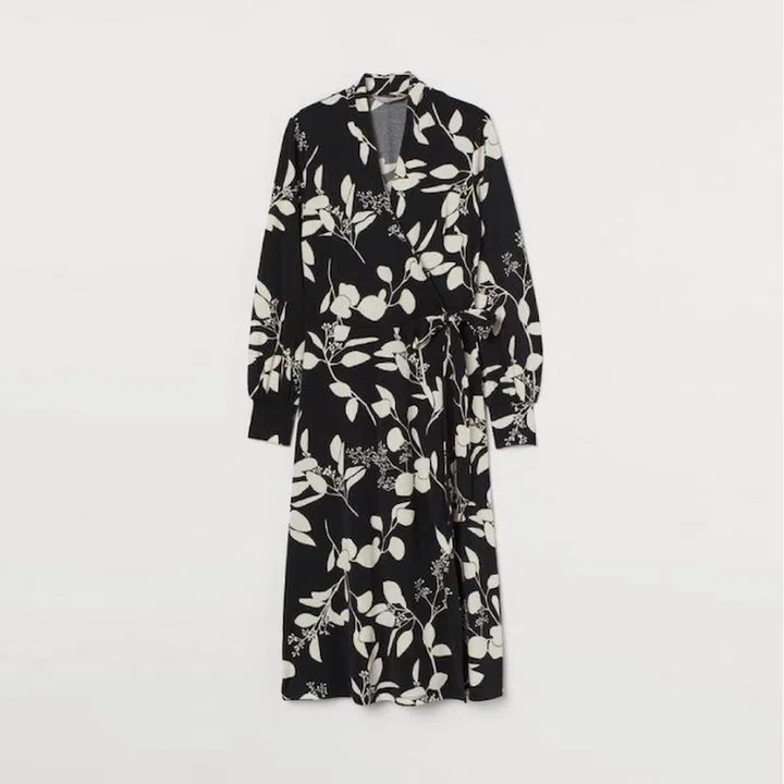For those who want a floral dress with an edgier bite, this black calf-length wrap dress mirrors both the femininity and dark romantic vibes. This dress comes with a gently draped collar, V-neck and wrapover front and features long, wide sleeves with wide cuffs and a seam at the waist with ties at one side — a little something that defines its gothic chic look.
