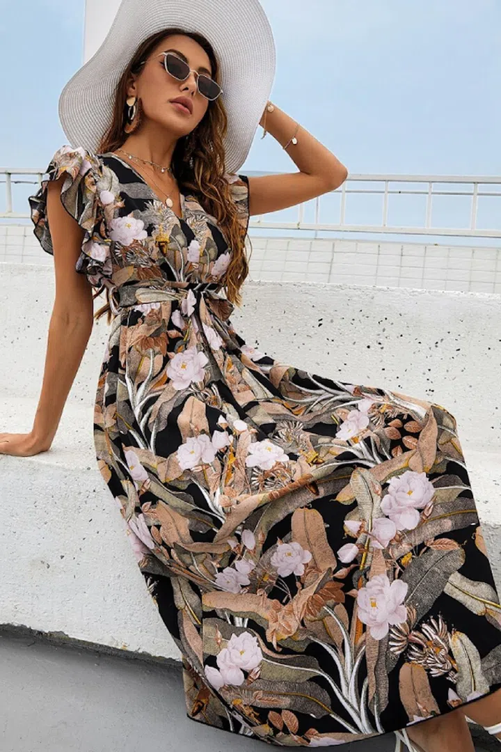 Breezy and comfortable for the warm weather, this midi dress has a flattering ruffle cuff that also comes with a floral belt that cinches the waist. With colourful and bright florals against a shade of black, this boho-chic dress instantly dials up your everyday look and is perfect for your next staycation.