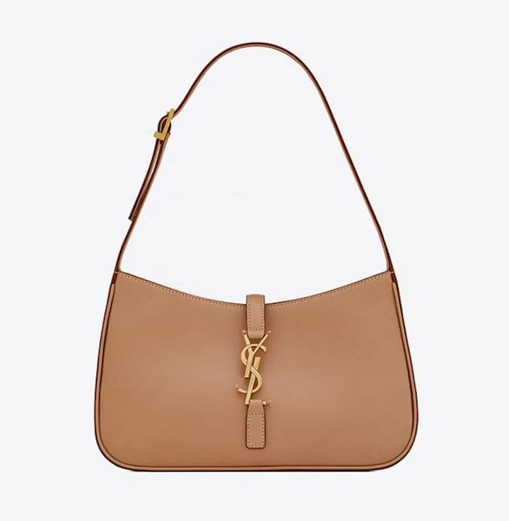 Worn either as a shoulder or a handbag, this elegant soft brown Saint Laurent bag is matched with a gold YSL logo.