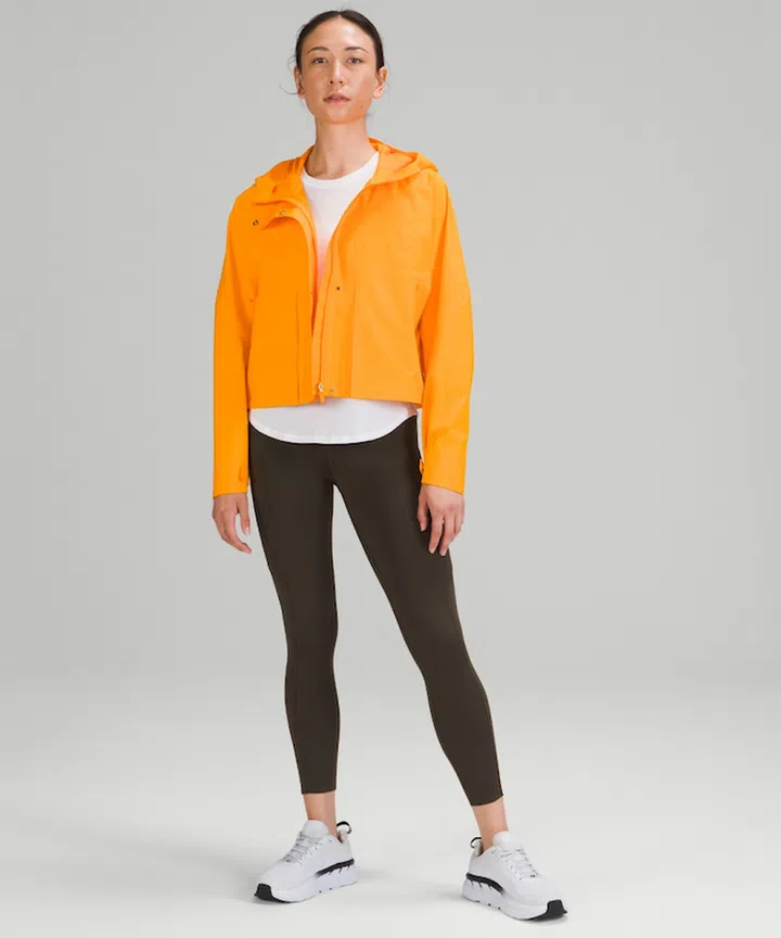 To inject some sunshine into your rainy day outfit, go for this clementine orange cropped jacket from Lululemon. Built with an adjustable hood, this jacket is also available in colours such as light pink, red, beige and black.