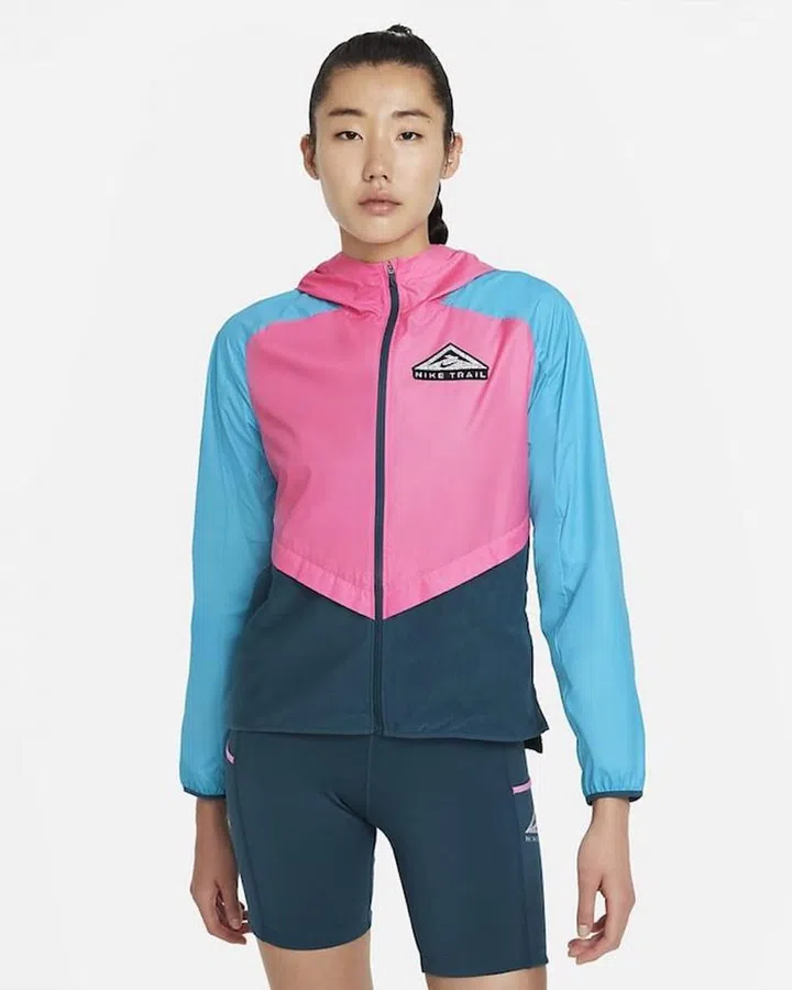 This Nike jacket is made with at least 75 per cent recycled polyester, and can be packed into the back pocket. Besides this eye-catching design, the jacket is also available in light pink. It is built with a hood.