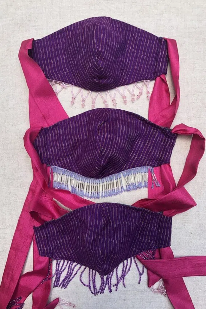 Finding a way to infuse face masks with a playful spirit, small independent label Abacaxi has designed a series of reversible cotton face masks with hand-beaded fringing in shades of baby pink, lilac and lavender, with long pink bows that are also finished at the ends with matching beaded fringe. A crafty design that speaks to the label’s love for South Asian textiles and traditional clothing influences, this mask will set you apart from the crowd with its distinctive design.