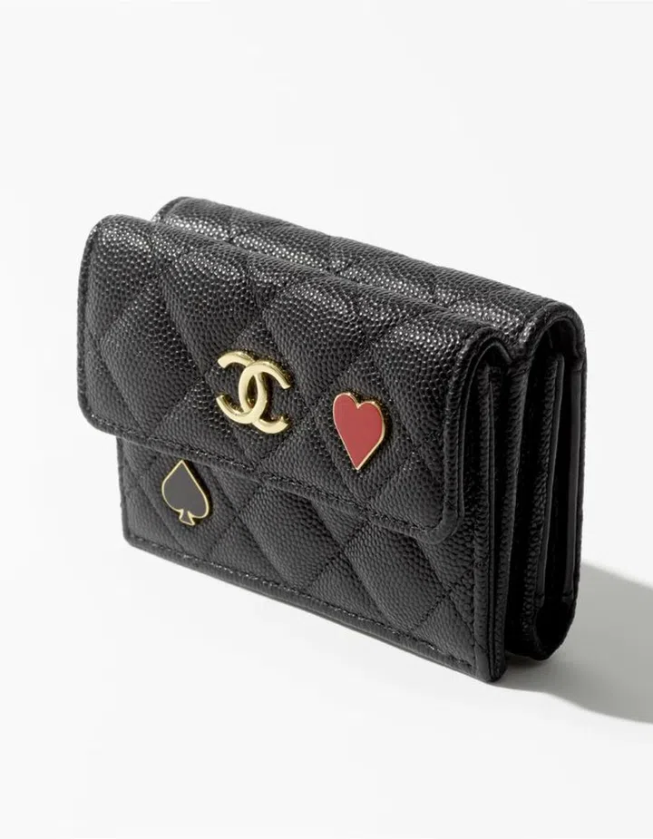 The classic grained leather wallet from Chanel gets a cute update with heart and spade-shaped hardware, and it's a jackpot in looks. Open up the flap to find a coin compartment, card slots and a long bill compartment.