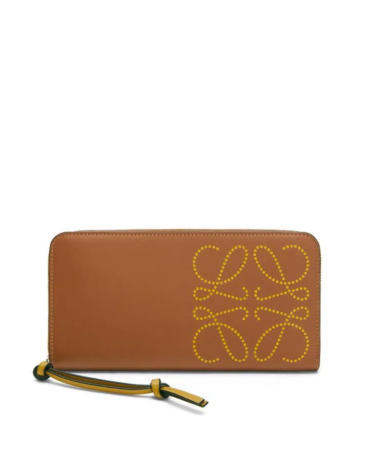Continuing on the classics is this smooth latte-coloured wallet. With punched holes forming Loewe's logo, the leather pull-zip opens to reveal eight card slots, two larget pockets for dollar bills, and two gusseted sections. There's also a zipped coin compartment to store loose change.