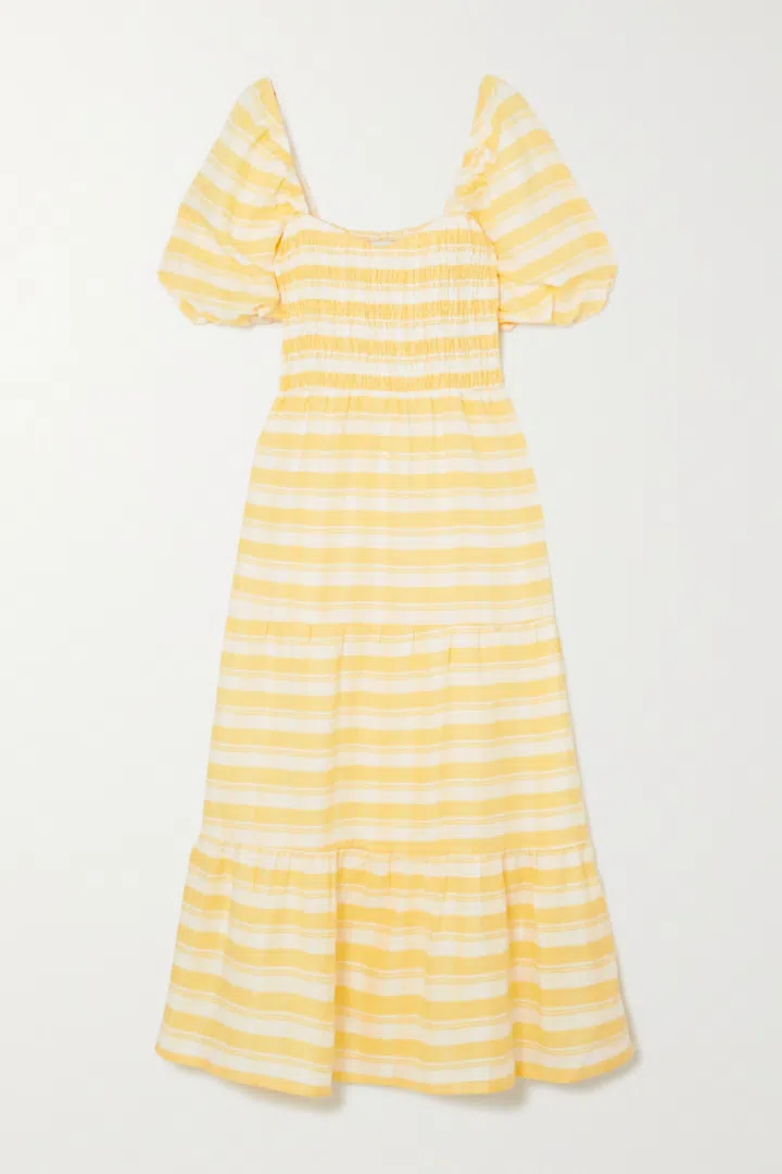 Faithfull The Brand Gianna Shirred Checked Linen Midi Dress, $354 from Net-a-Porter