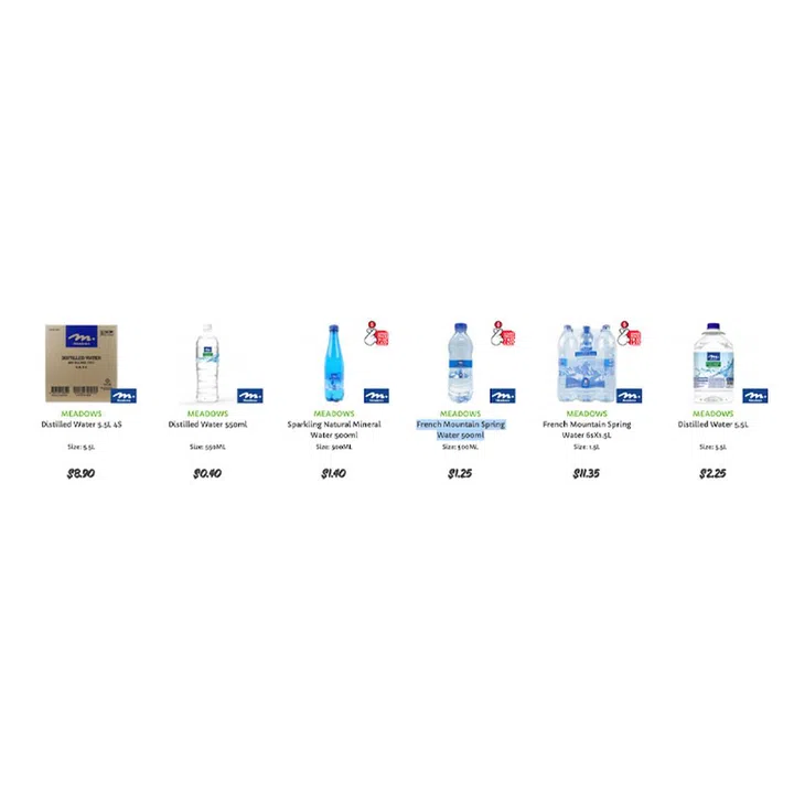 For those who want to feel fancy but don’t wanna spend too much, there is also Meadows French Mountain Spring Water and Meadows French Mountain Spring Water available for S$1.40 and S$1.25 respectively.