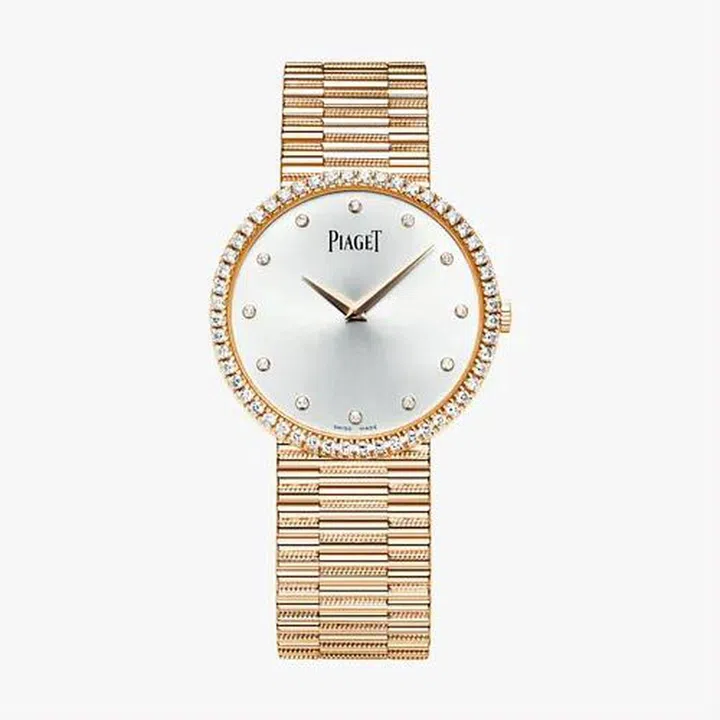 Piaget’s traditional jewellery watch is a must-have for special occasions. This precious arm candy has an 18K pink-gold bracelet and is cased in an 18K pink gold set with 52 brilliant-cut diamonds (approx. 0.8 ct) and a dial set with 12 brilliant-cut diamonds (approx. 0.1 ct). This ultra-thin and feminine watch, that’s an instantly recognisable model synonymous with Piaget, is known for the twisted threads on its bracelet that are subtly welded to the links.