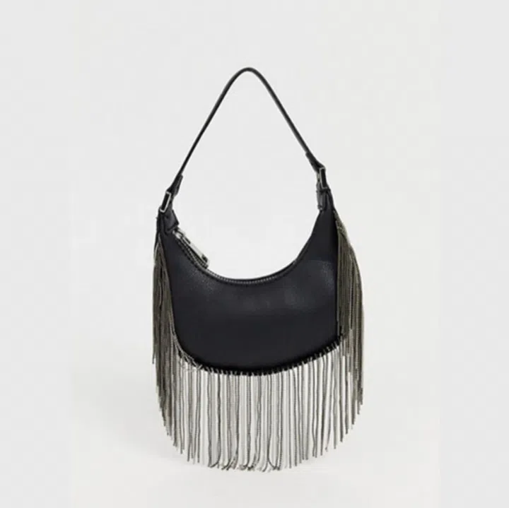 The baguette bag gets an update with a badass chainmail fringe to give any outfit a rock and roll edge.