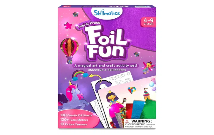 It's a no-mess arts and crafts activity for kids featuring unicorns and princesses. This Skillmatics set comes with over a hundred foam stickers, colourful foil sheets, ten picture canvases, and googly eyes to get their creativity flowing.