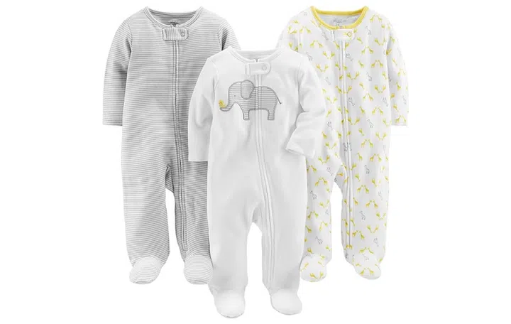 Available in a three-pack, these neutral newborn baby onesie sleep sets can be used for both boys or girls. The reversible zipper zips all the way from the chin to toes for extra warmth and protection, with soft ribbed binding.