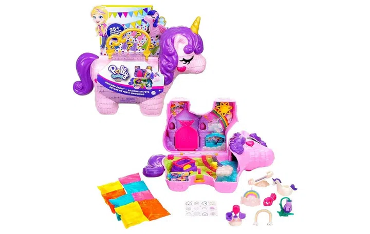 Let your child's creativity run wild with this Polly Pocket Unicorn Party Playset. The unicorn opens up to a world of fun, including two Micro Polly and Lila Dolls and 25 cute accessories, including sand art, stickers and a built-in castle.
