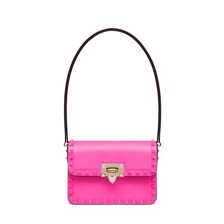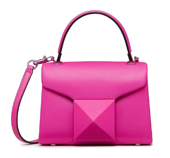 Valentino's signature One Stud design in lambskin gets a vibrant makeover with the exclusive Pink PP hue, which dominated the brand's AW22 collection.